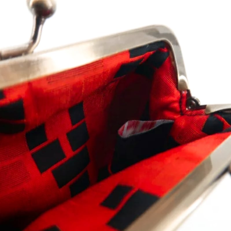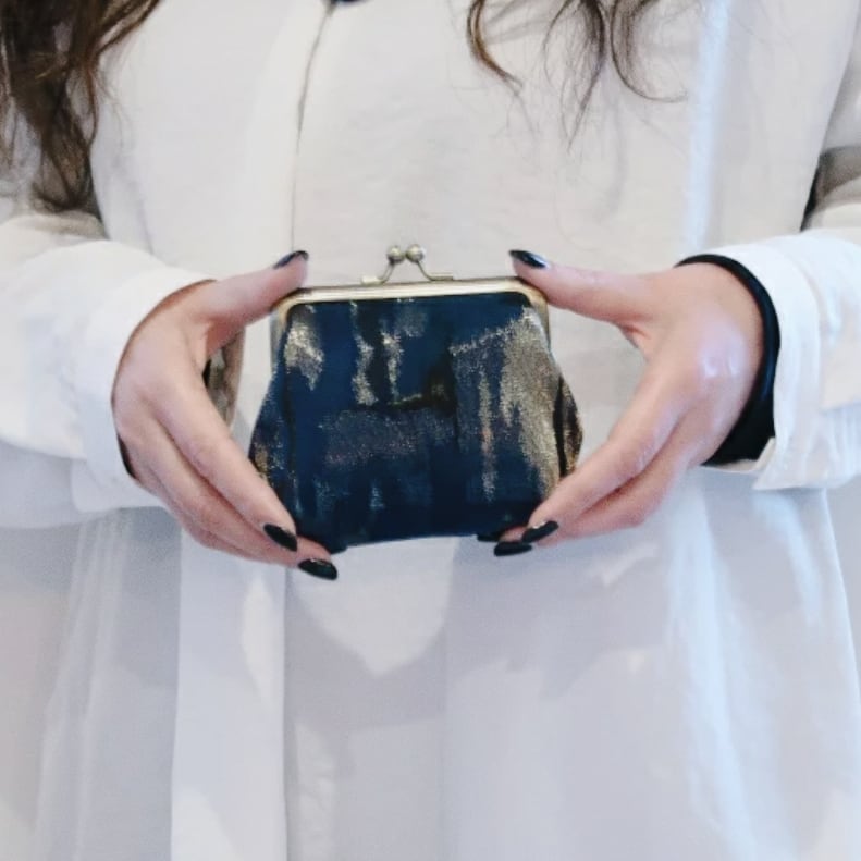 シルク100%の生地に、デザインは「鶴と松」ゴールドの口金は高級感があり、見た目より大容量です。