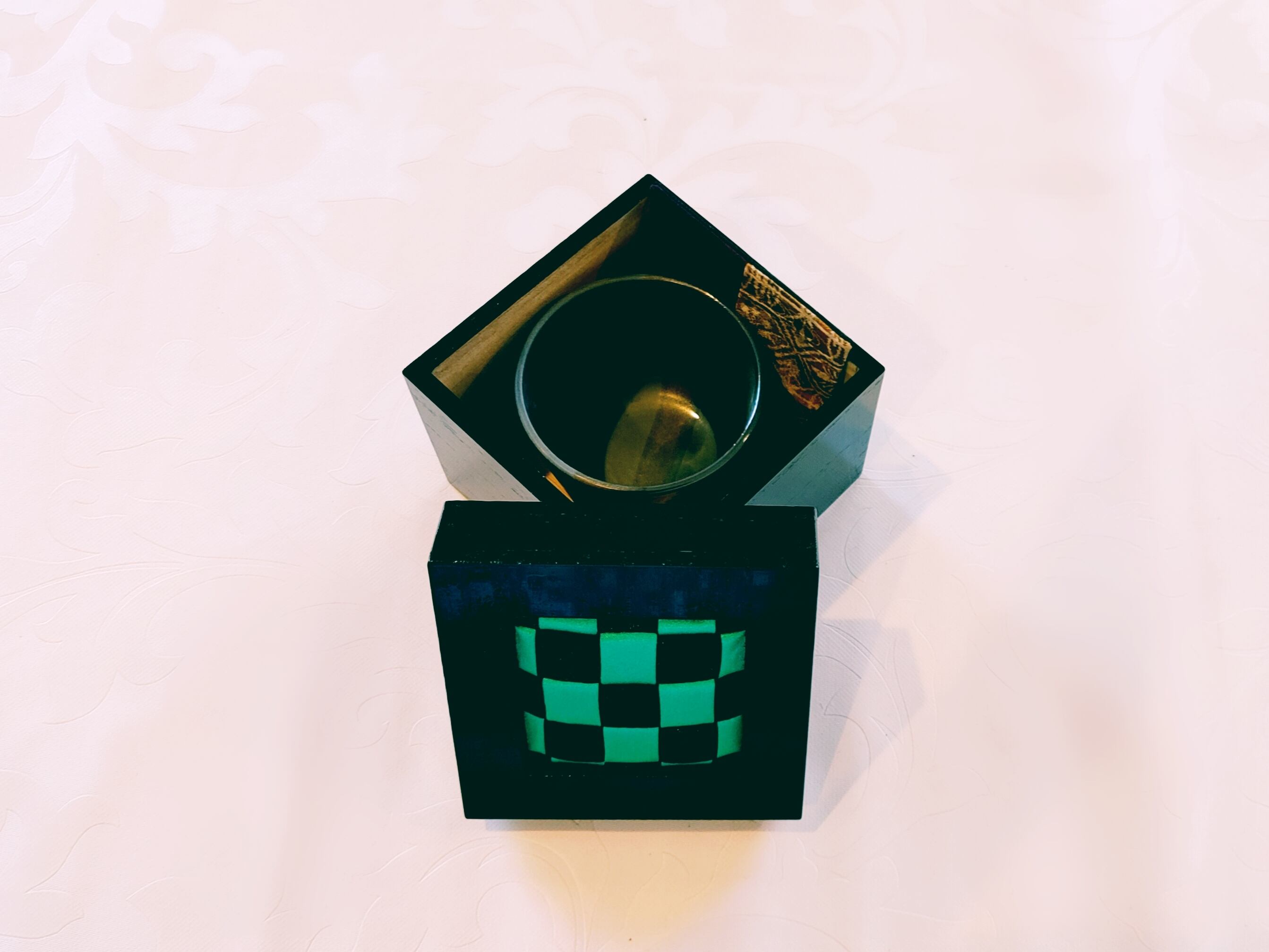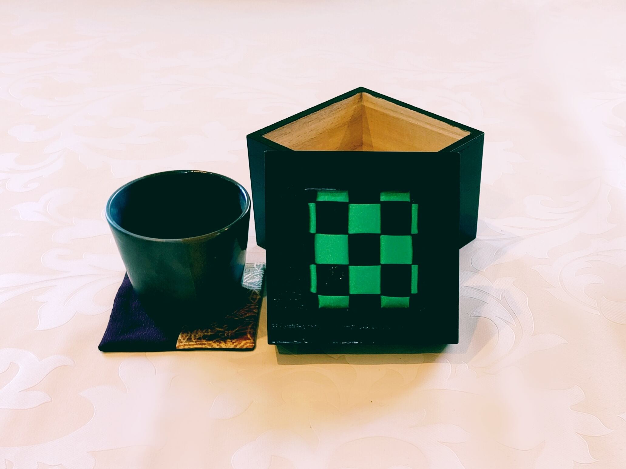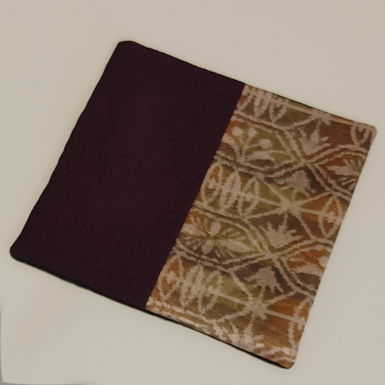 蓋の上面はパッチワーク師範科卒業の講師が、着物生地のメッシュワークを組み込み、とても雅な雰囲気です。