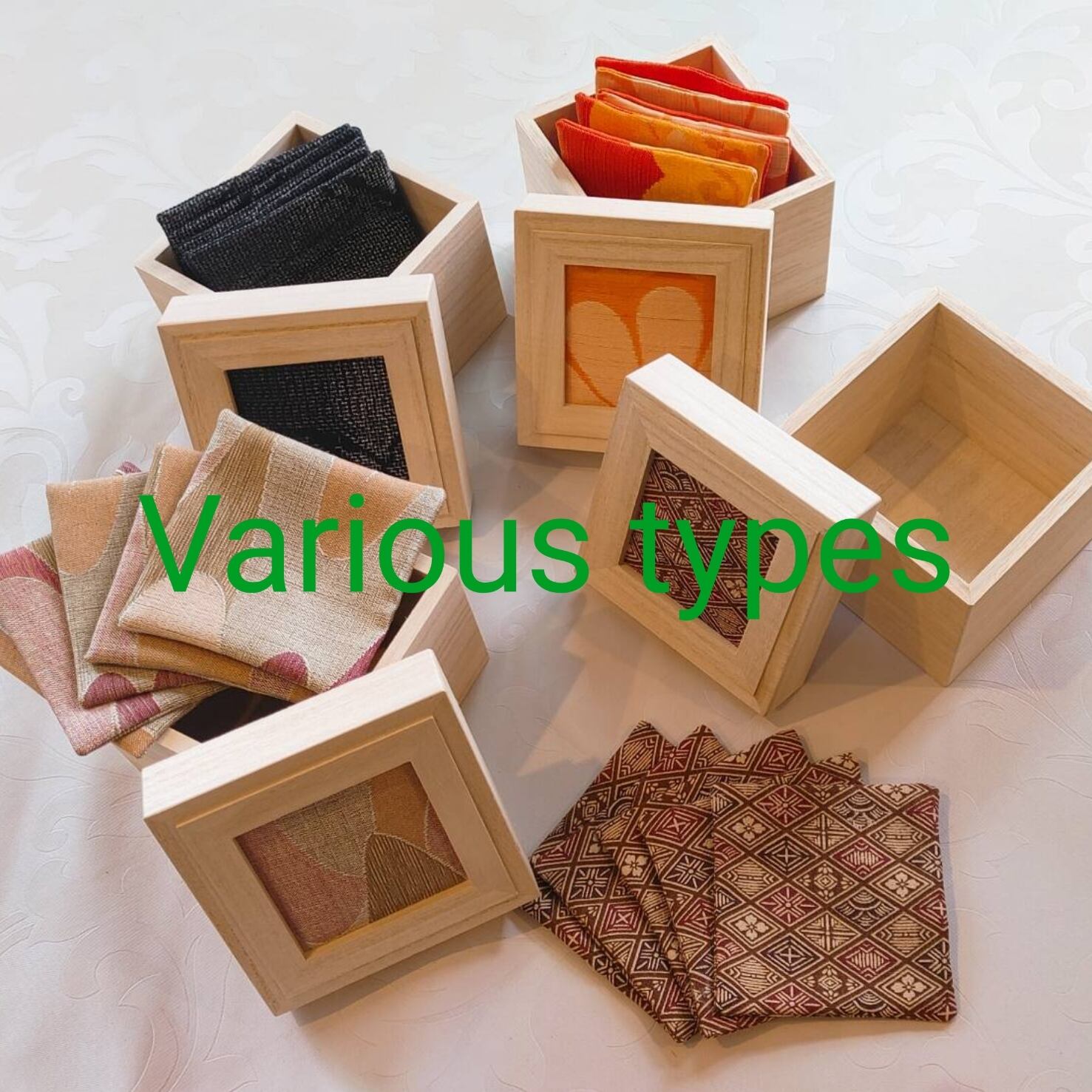 木目が美しい白木CUBE コースターセット(和柄)は、着物や帯を再利用して作られたオリジナルデザイン。和風の柄が美しく、テーブルを上品に演出してくれます。桐箱に収納されているので、プレゼントにも最適です。